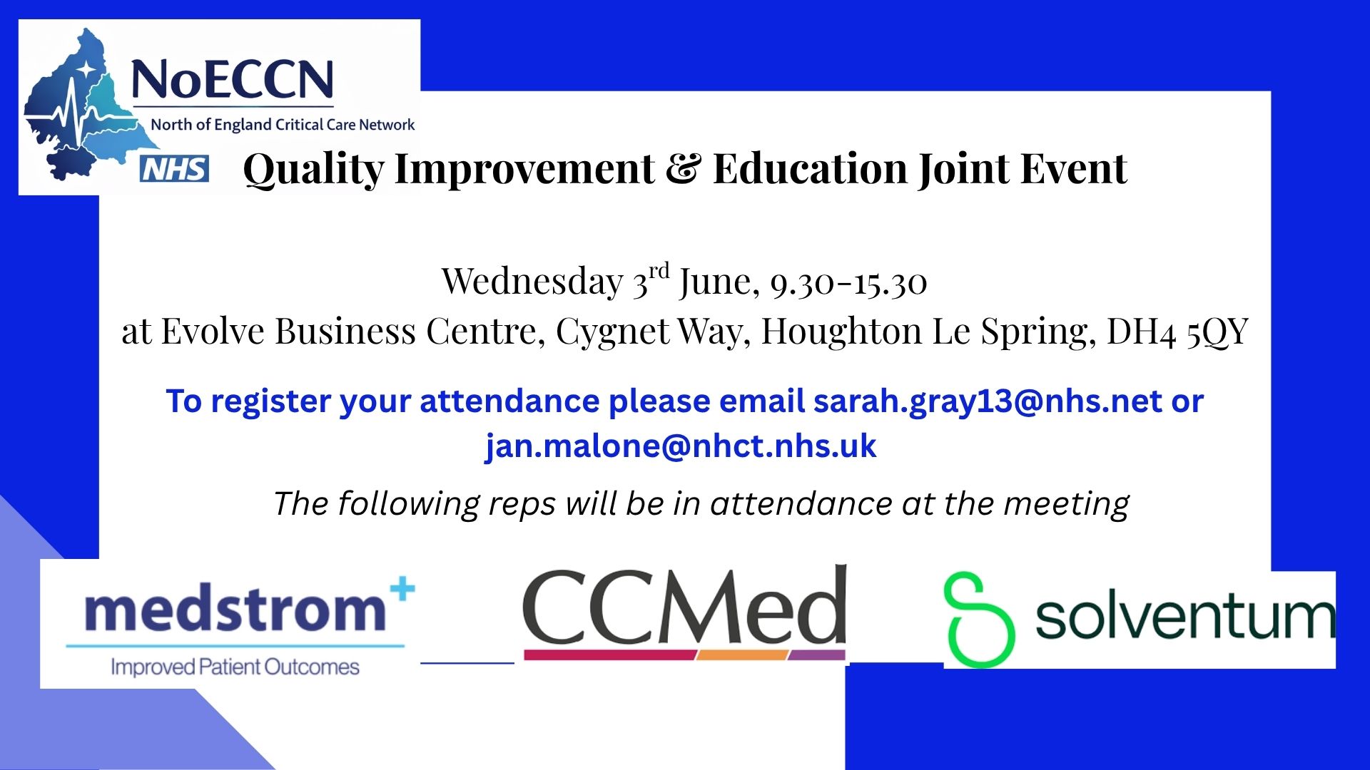 Meeting Quality Improvement & Education Joint Event When: 3rd June 2026 – 09:30 – 15:30 Where: Evolve Business Centre, Cygnet Way, Houghton le Spring DH4 5QY Spaces: 40 Register Quality Improvement & Education Event Register Leave this blank First Name * Surname * Email Address * Job Title * Hospital * Line Manager Email Register