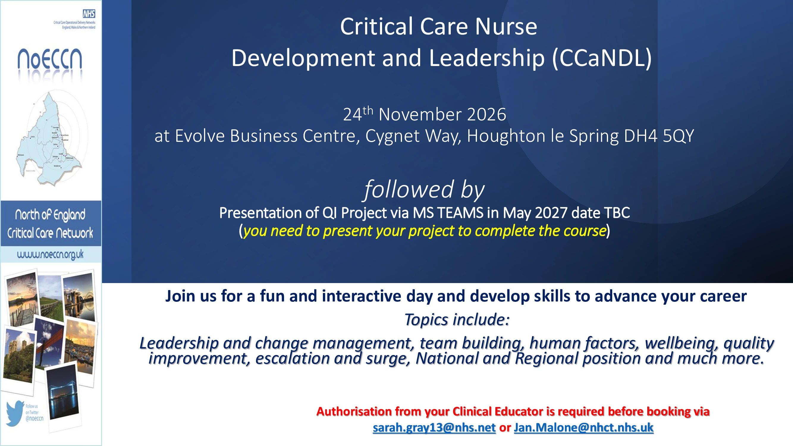 Join us for a fun and interactive day and develop skills to advance your career Topics include: Leadership and change management, team building, human factors, wellbeing, quality improvement, escalation and surge, National and Regional position and much more. Authorisation from your Clinical Educator is required before booking