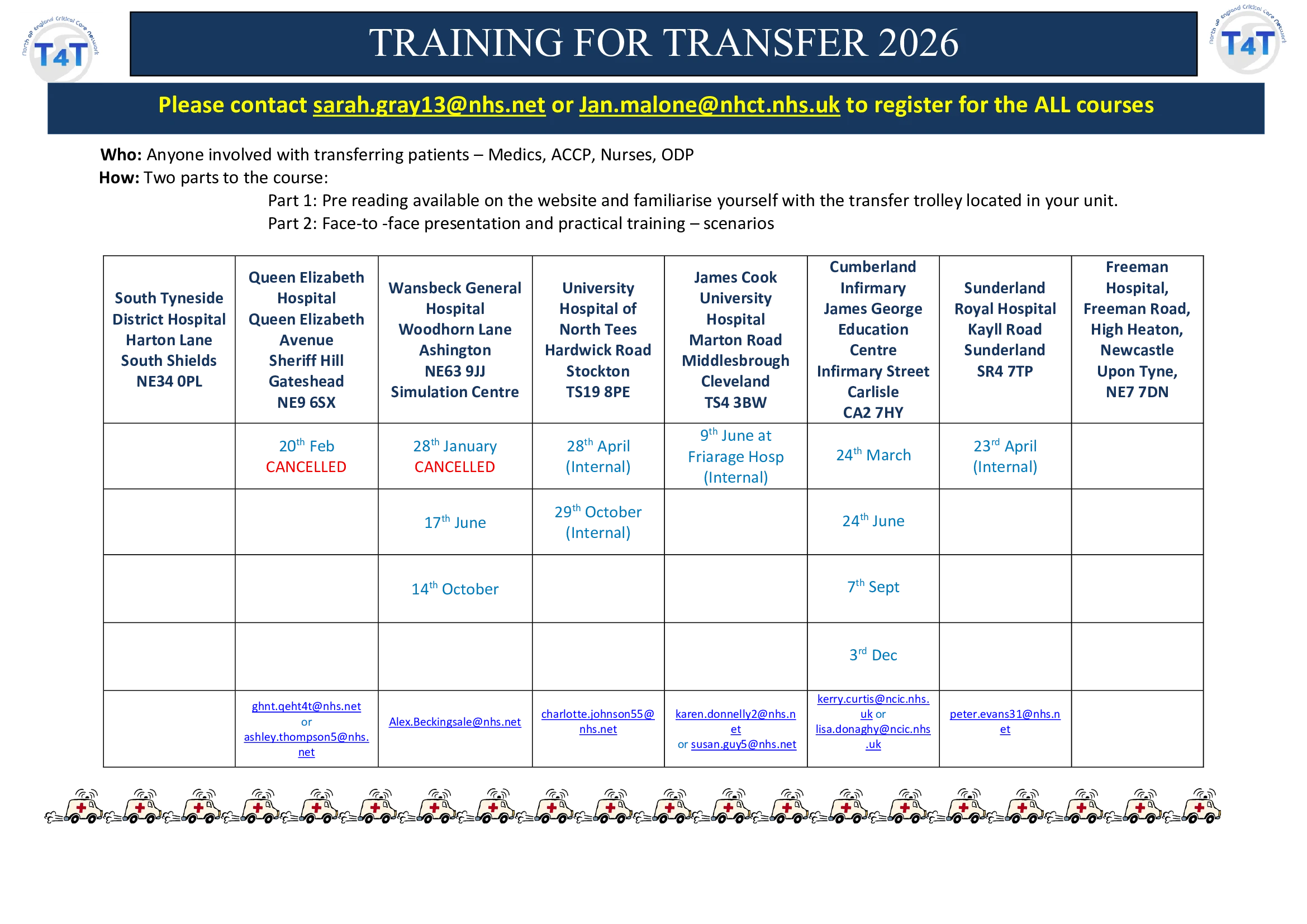 T4T will take place in SIM Suite, Education Centre, Cumberland Infirmary, Newton Road, Carlisle, CA2 7HY This course is free and only intended for regional staff Faculty Contact for this course: Kerry.Curtis@ncic.nhs.uk
