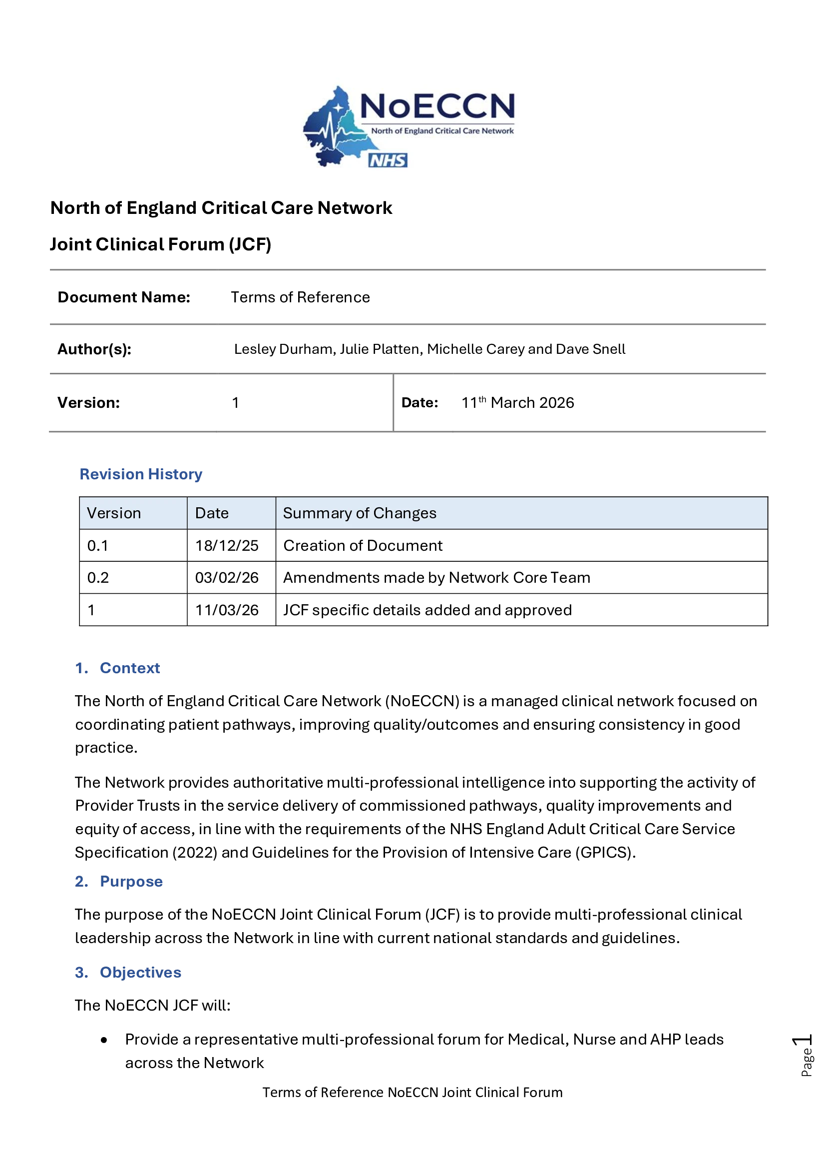 Joint Clinical Forum The purpose of the NoECCN Joint Clinical Forum (JCF) is to provide multi-professional clinical leadership across the Network in line with current national standards and guidelines. Joint Clinical Forum Wednesday 10th June Joint Clinical Forum Wednesday 9th September Joint Clinical Forum Resources: JCF JCF ToR Download PDF