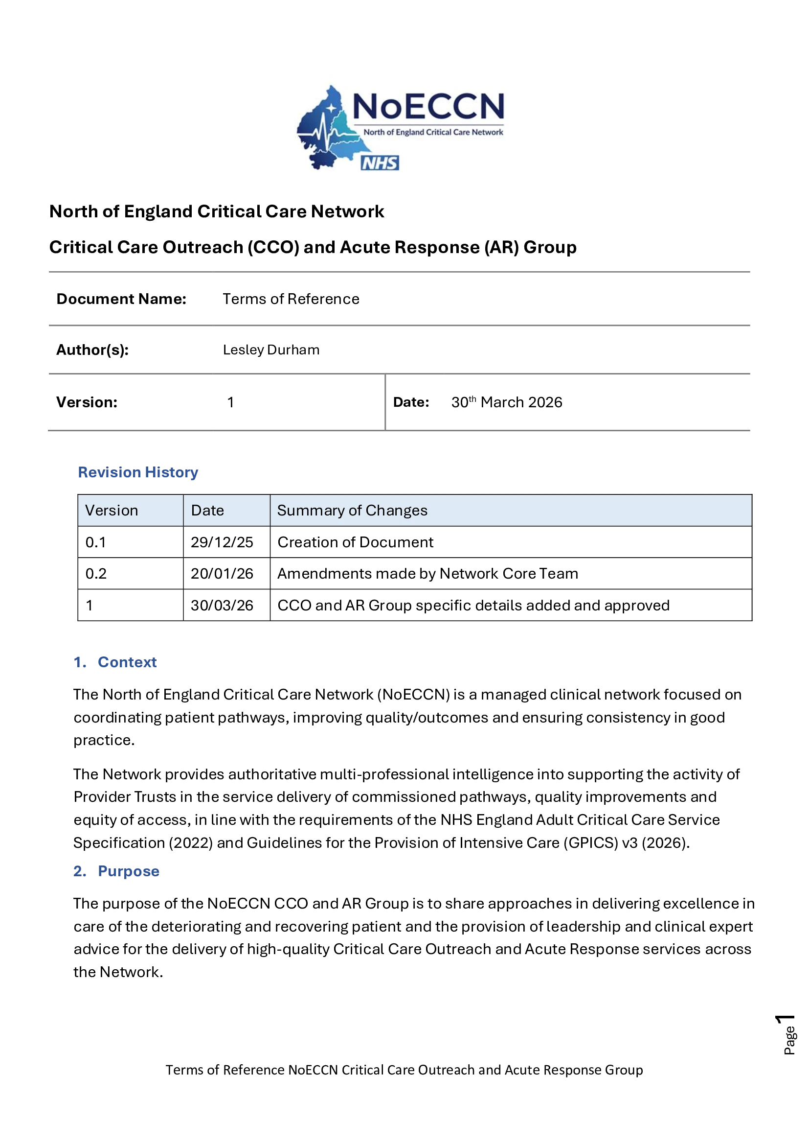 The purpose of the NoECCN Critical Care Outreach and Acute Response Group is to share approaches in delivering excellence in care of the deteriorating and recovering patient and the provision of leadership and clinical expert advice for the delivery of high-quality Critical Care Outreach and Acute Response services across the Network.