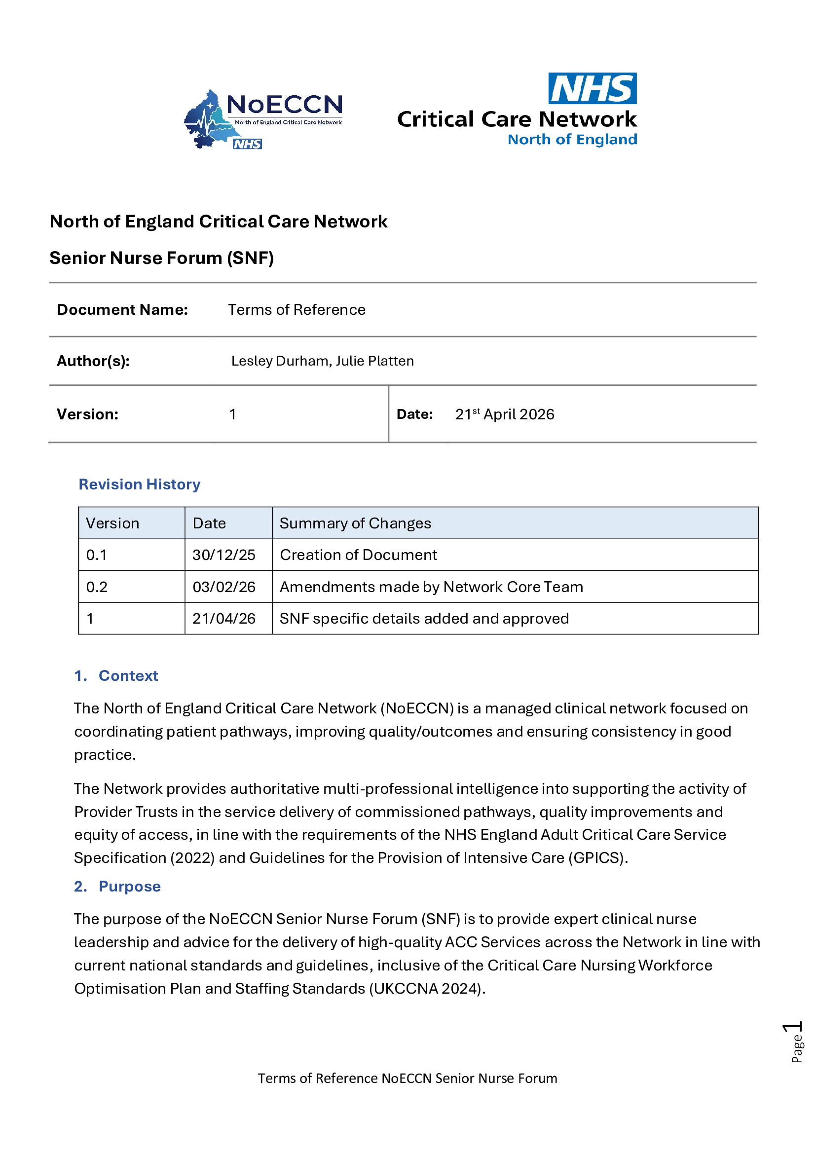 The purpose of the NoECCN Senior Nurse Forum (SNF) is to provide expert clinical nurse leadership and advice for the delivery of high-quality ACC Services across the Network in line with current national standards and guidelines, inclusive of the Critical Care Nursing Workforce Optimisation Plan and Staffing Standards (UKCCNA 2024).