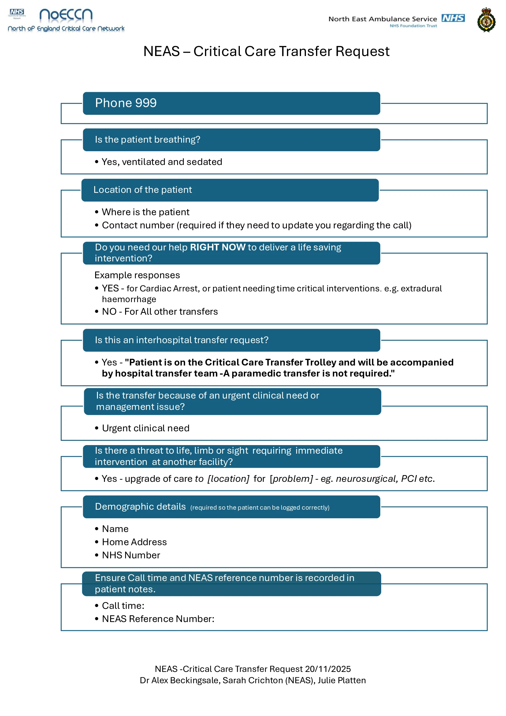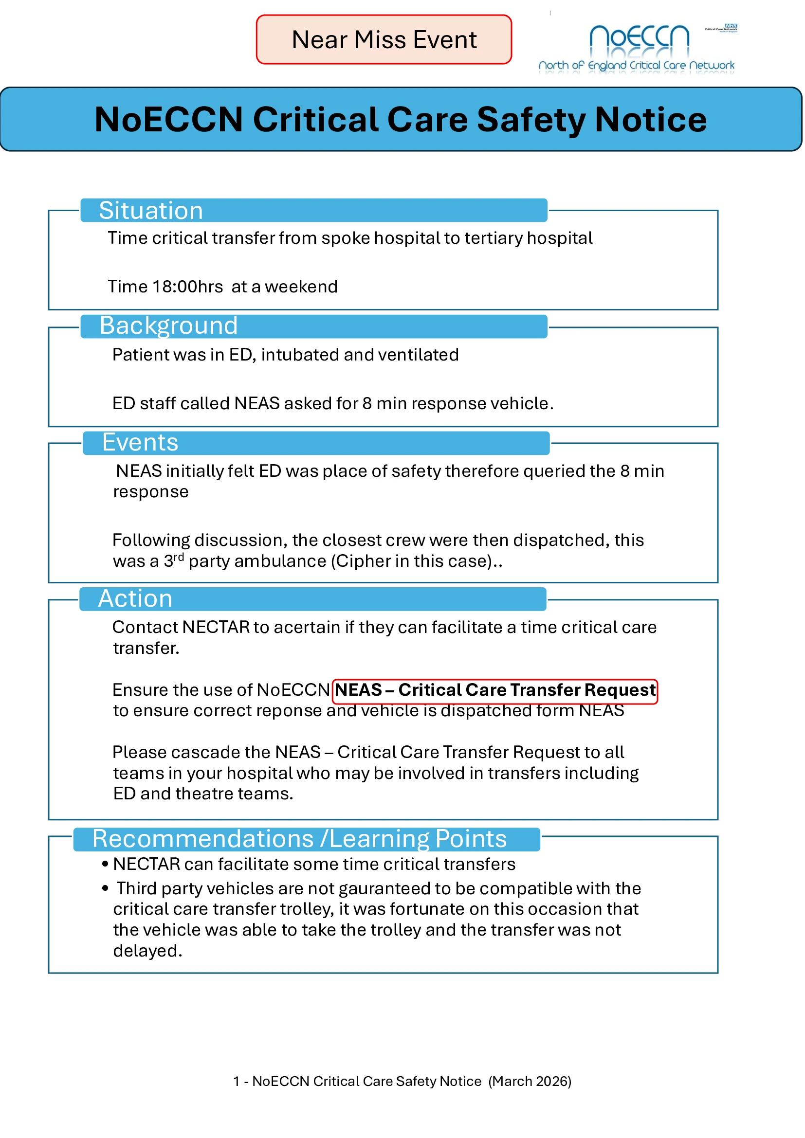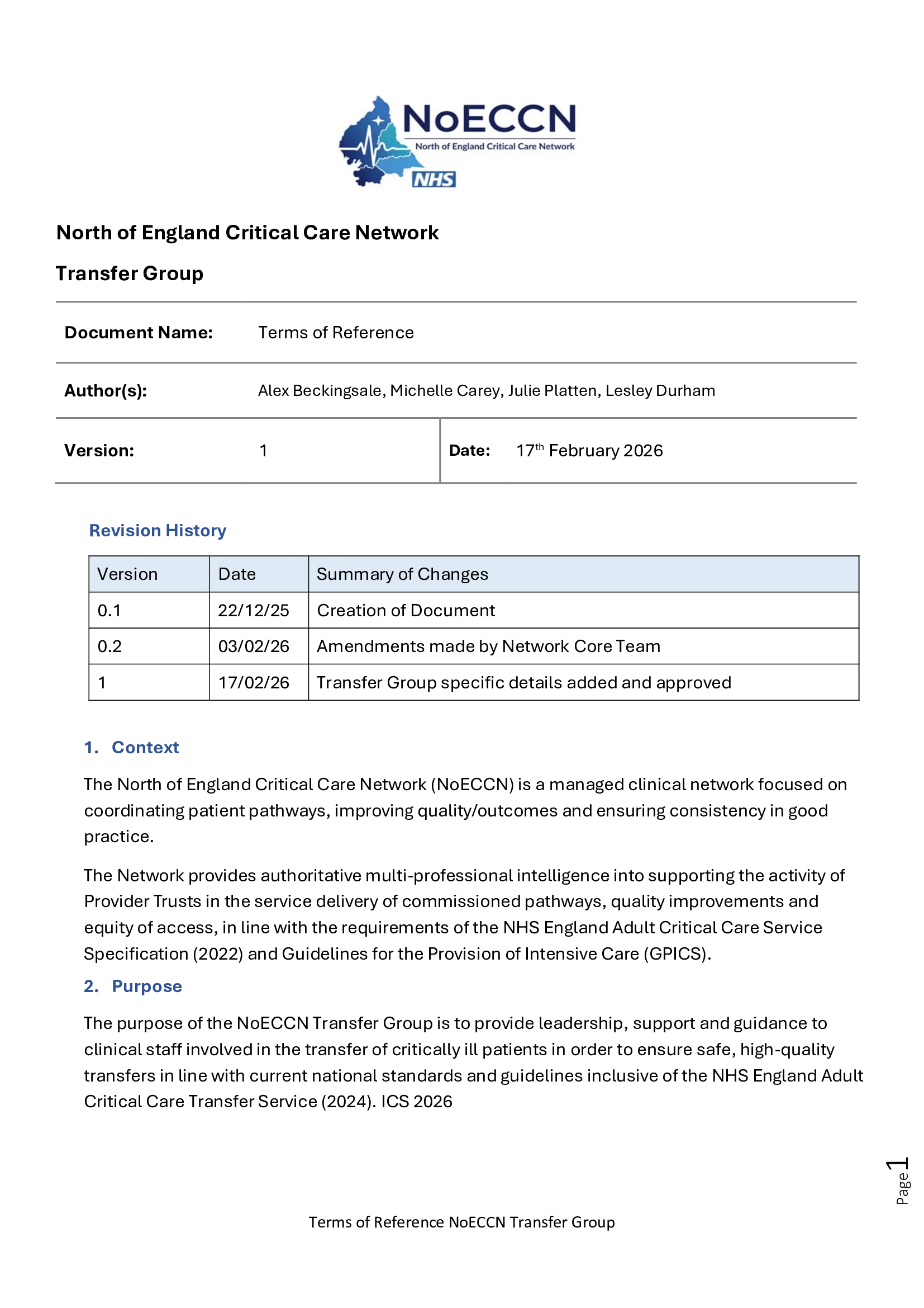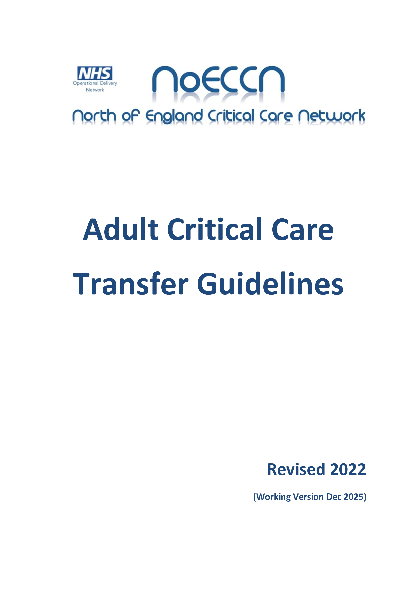 The purpose of the NoECCN Transfer Group is to provide leadership, support and guidance to clinical staff involved in the transfer of critically ill patients in order to ensure safe, high-quality transfers in line with current national standards and guidelines inclusive of the NHS England Adult Critical Care Transfer Service (2024). ICS 2026