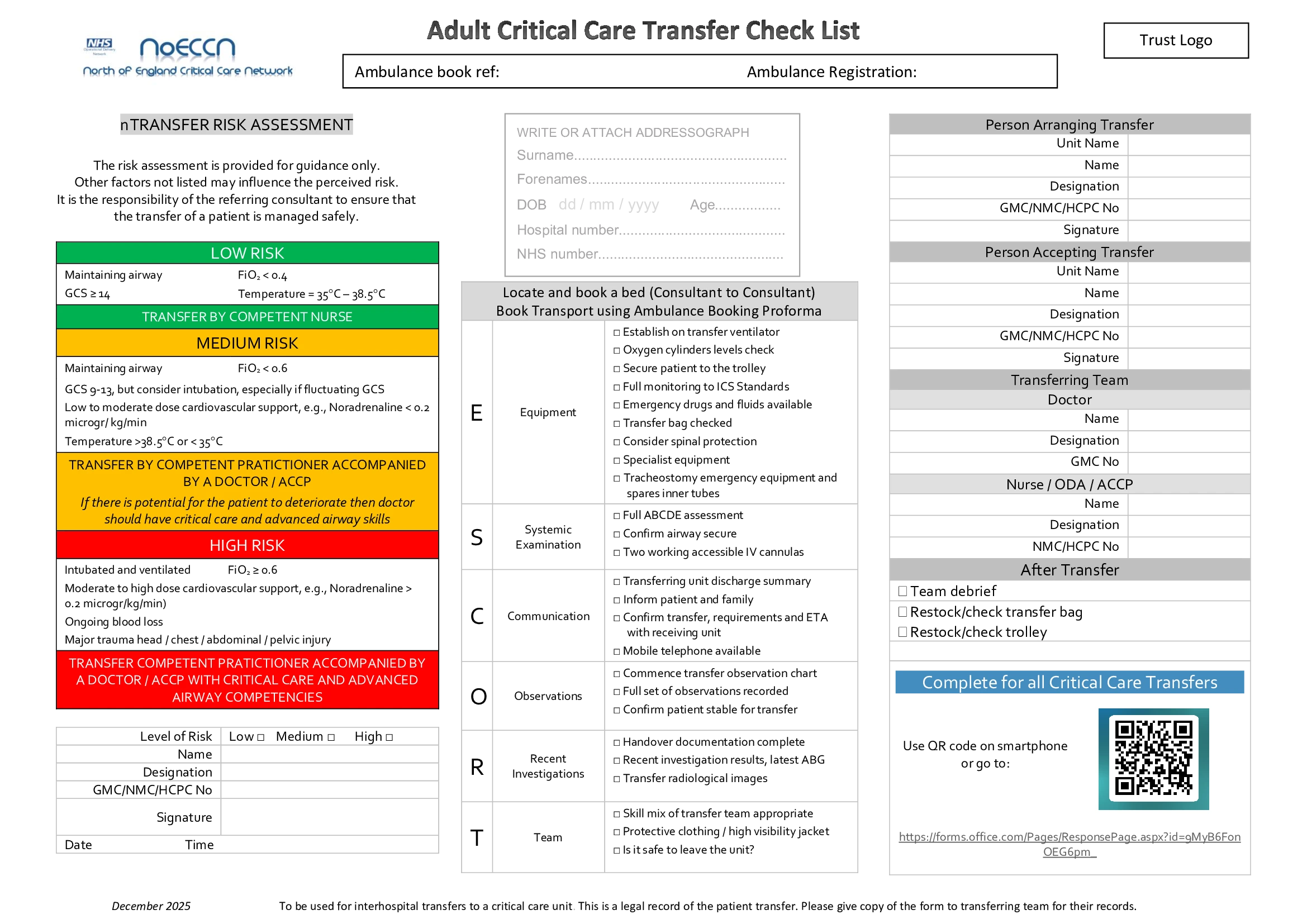 To be completed for any Critical Care transfer using the Critical Care transfer trolley