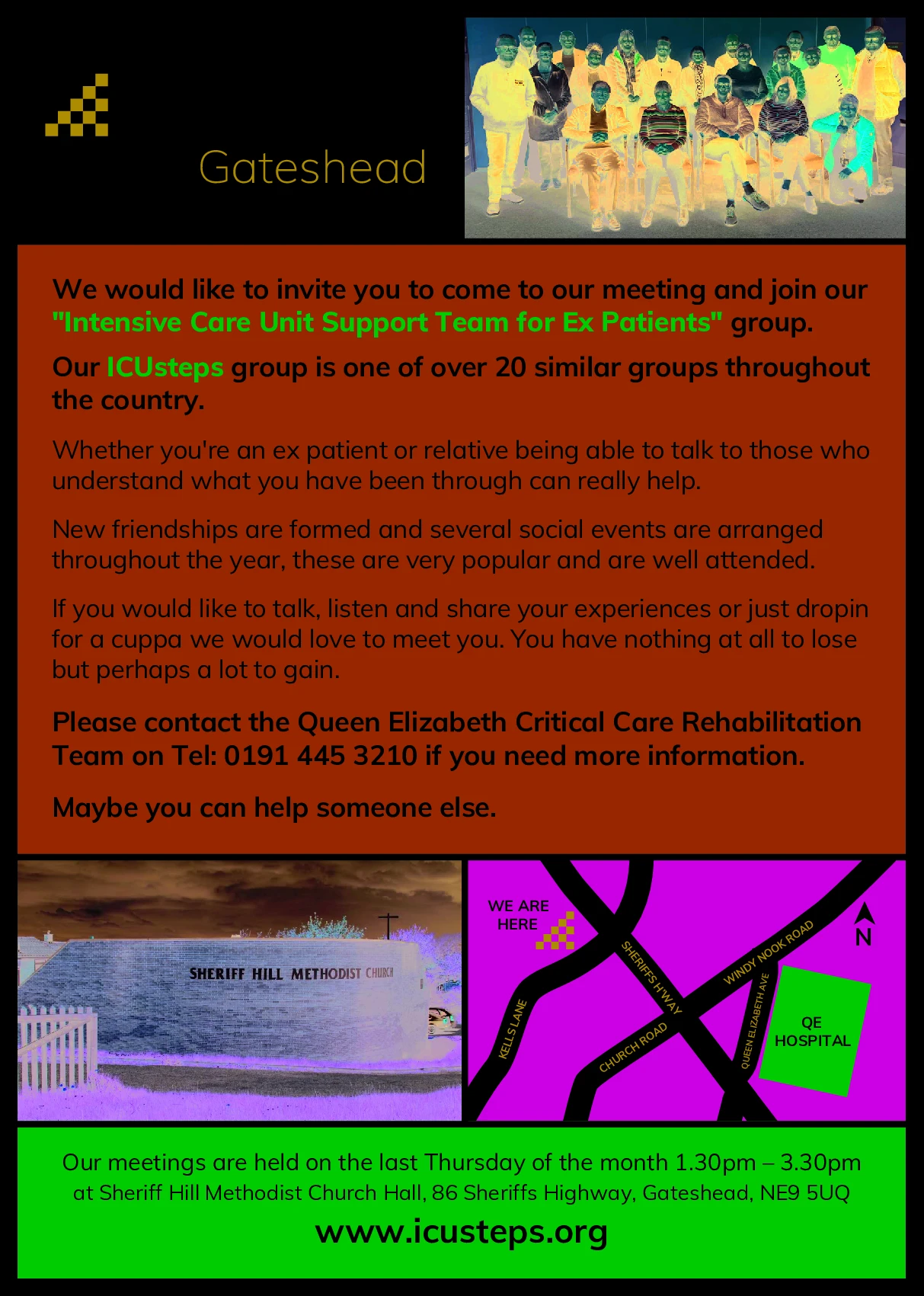 The North of England Critical Care Network has been working alongside the Critical Care Units within the region to set up ex-patient/relative satellite support groups. Some groups are registered by ICUsteps and some are new support groups.